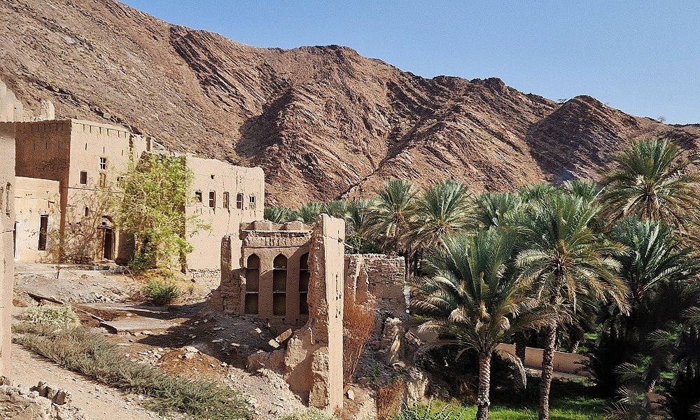 mountains chain in OMAN. We will pass by the oldest small towns of Oman Bahla with its fort (outside visit). We will stop at the palm groves at Al Hamra to see its Falaj system. we will